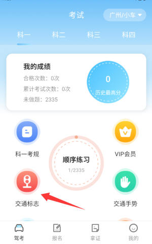 1、进入学驾驶证科目一科目四无忧后,在首页选择"交通标志"专题,进入学习页面。