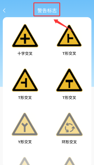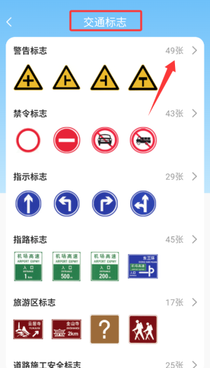 3、通过上下滑动屏幕浏览更多交通标志,系统会分类展示各类禁令、指示和警告标志。