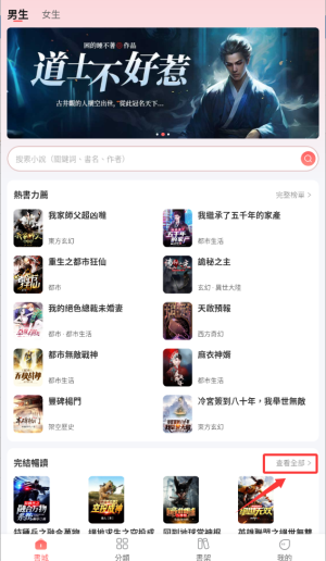 1、进入言情小说后,在首页导航栏选择"完结榜单"栏目,这里展示已完结的优质作品。