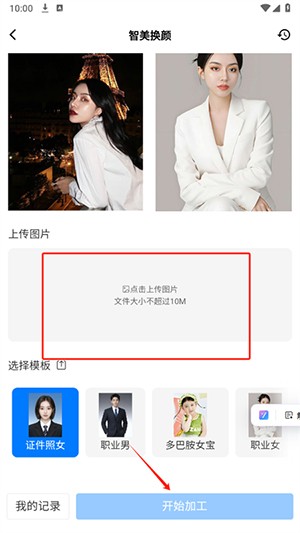 5、以“智美换颜”为例,只需上传图片,挑选适配的模板,点击“开始加工”,就能快速生成具有个性化的效果。