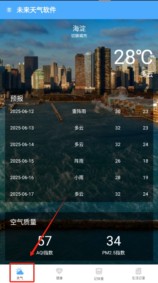 1、在手机应用商店搜索未来天气,安装后打开,进入软件主界面。