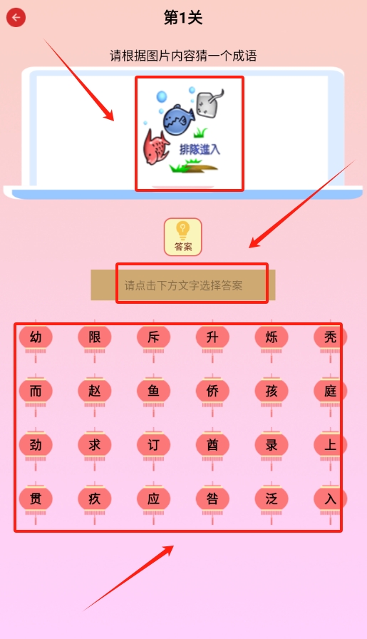 3、想玩的话,直接点击游戏入口,拿看图猜成语来说,依据图片去猜,把下方汉字按顺序填进框里就行。
