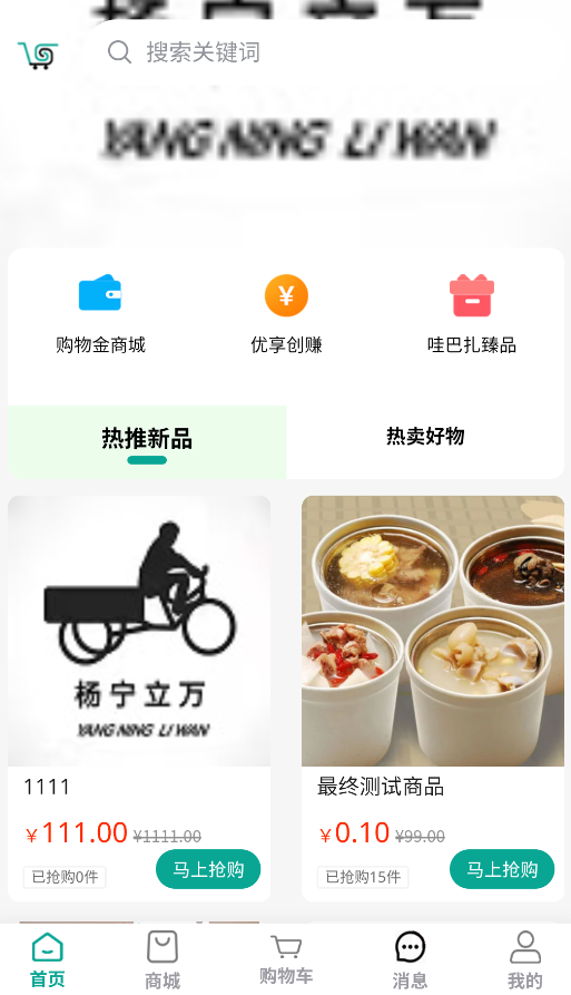 1、启动哇巴扎后,首页展示"购物金商城"、"优享创赚"等特色购物专区,可直接选购商品。