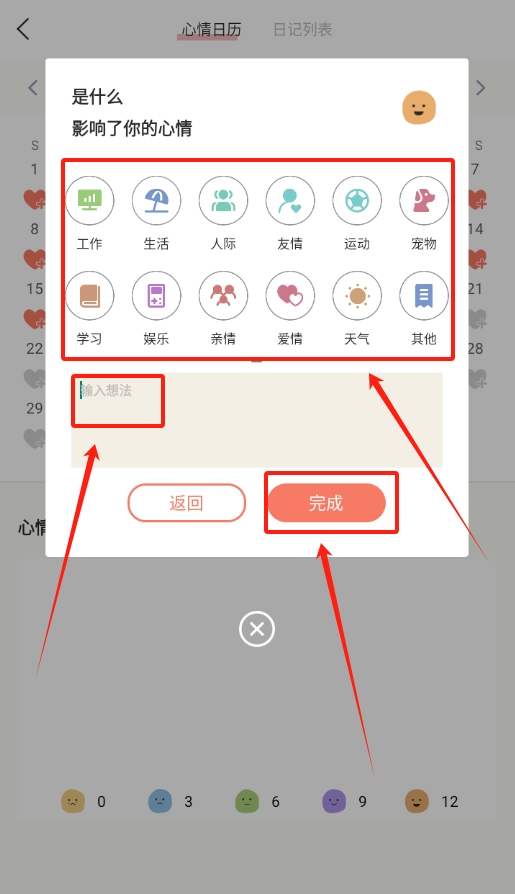 3、先挑选出那些会影响心情的事情,接着把内心的想法记录下来,最后点击完成按钮就可以了。