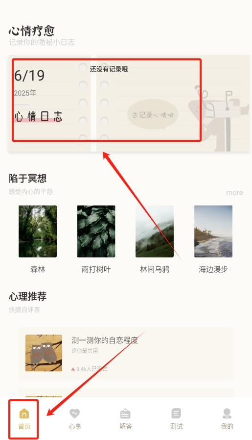 3、心情日志的具体记录操作:点击心情日志功能模块,通过记录当下的心情状态来缓解情绪压力。