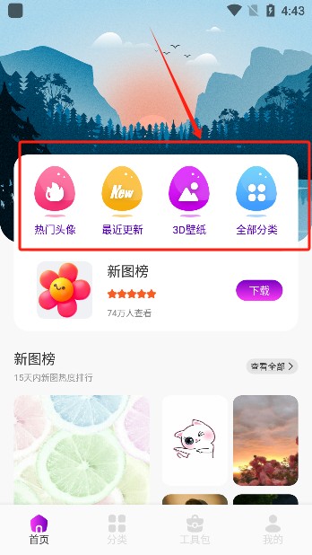 1、第一步是进入主界面。映入眼帘的是简洁清晰的布局,界面上包含头像、壁纸等多个功能模块,用户能够依据自身需求快速挑选并进行浏览。