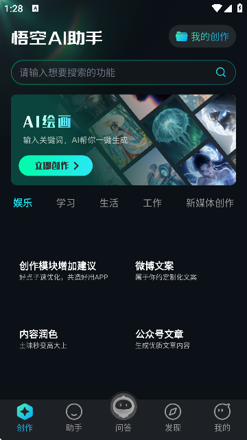 4、用户也能在【创作】板块找到各类功能,像AI创作功能就包含在内,用户还可以借助它进行AI绘画、内容润色、文案创作、撰写公众号文章等操作。