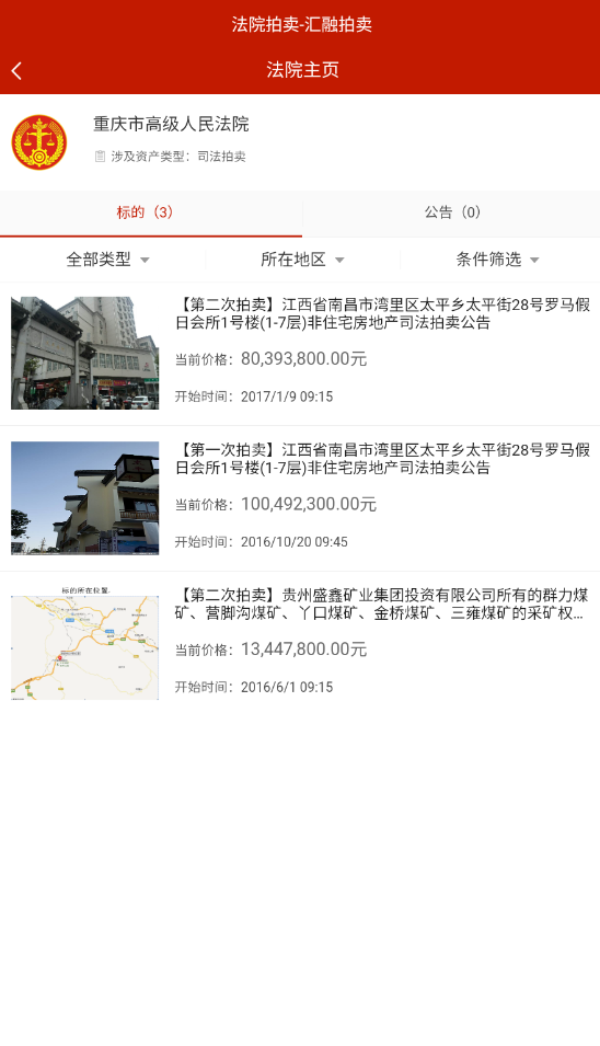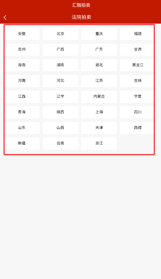 2、选择"法院拍卖"功能后,可按省份、城市筛选目标区域的拍卖标的物。