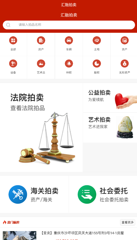 1、启动汇融拍卖后,首页展示司法拍卖、资产处置等多种拍卖类型入口。