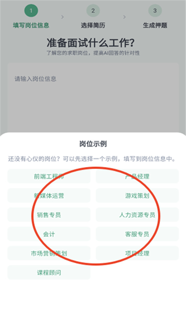 3、打开软件后,选定模拟面试对应的岗位,平台便会自动生成该岗位的相关信息。