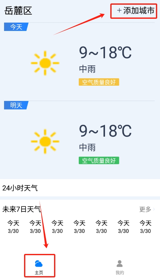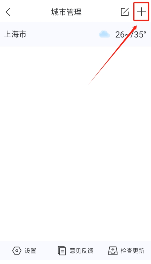 1、打开软件直接看首页,右上角有个加号添加城市,点它就能开始操作了。