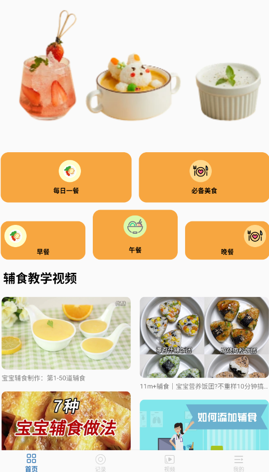 1、启动辅食后,首页分类展示不同月龄宝宝的食谱类型(如泥糊状、颗粒状等)。