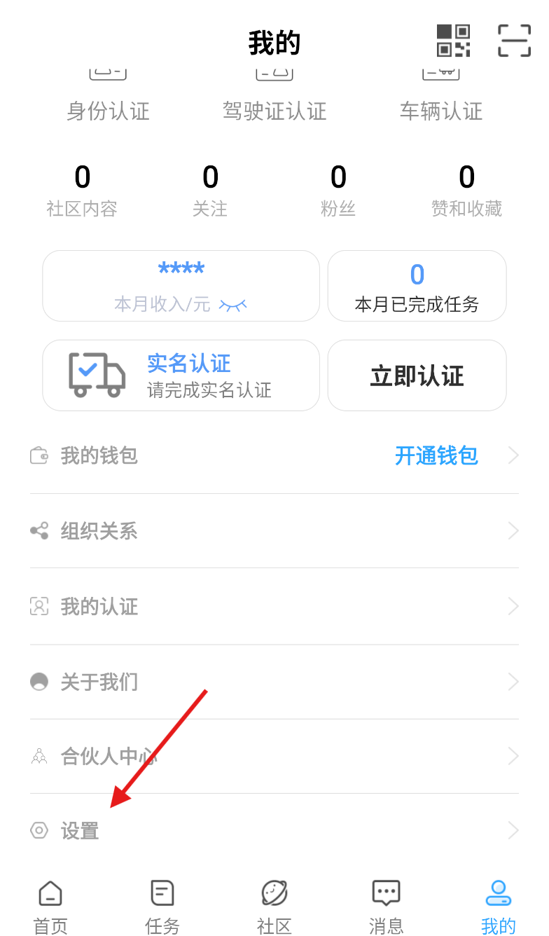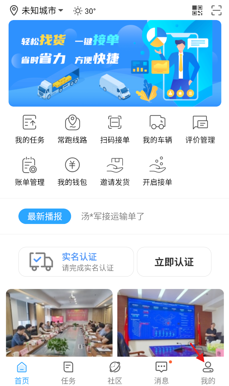 1、启动物流公社司机应用,在主界面找到并点击“我的”选项,进入个人中心页面。