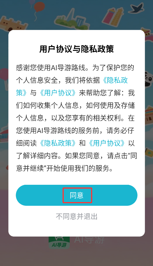 1、首次启动AI导游路线时,系统会弹出用户协议确认窗口,点击"同意"后方可进入应用主界面。