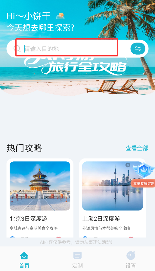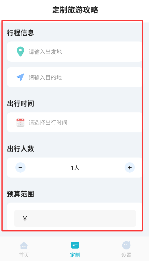 4、个性化定制页面支持设置行程天数、出发时间和预算范围,系统会智能生成专属旅行方案。