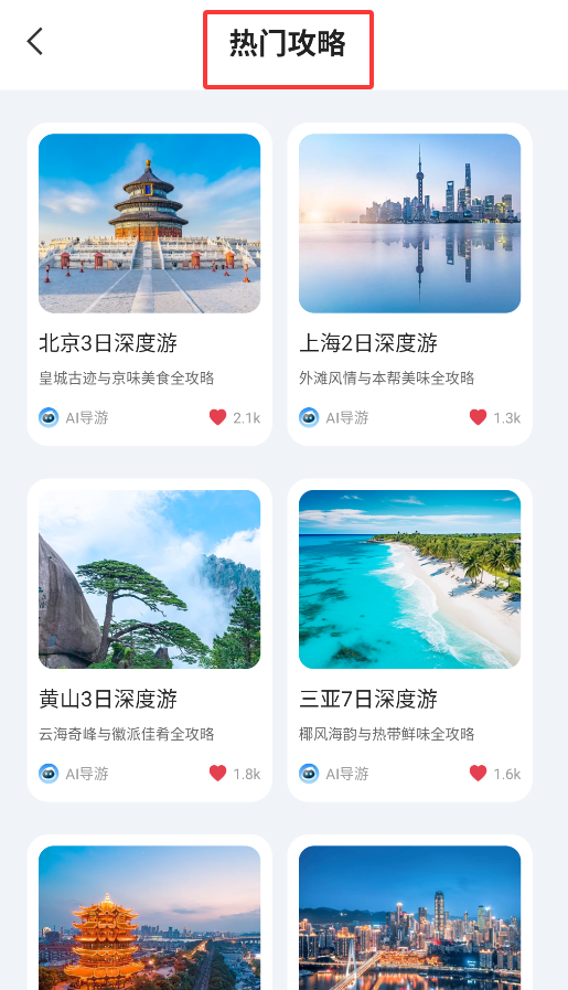 3、热门推荐专区展示当前季节最受欢迎的旅游景点和经典游玩路线。