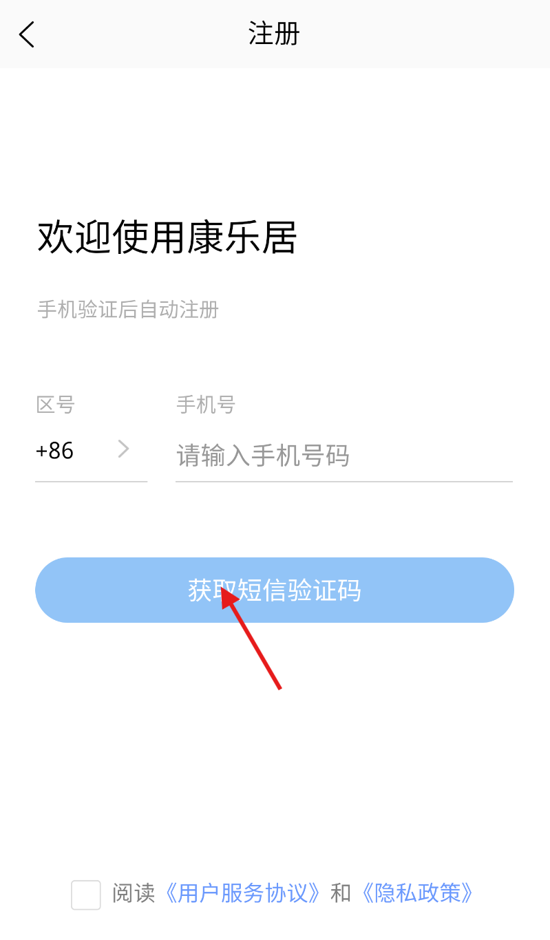 4、在注册页面输入本人手机号,点击获取验证码,填入收到的验证码即完成注册。