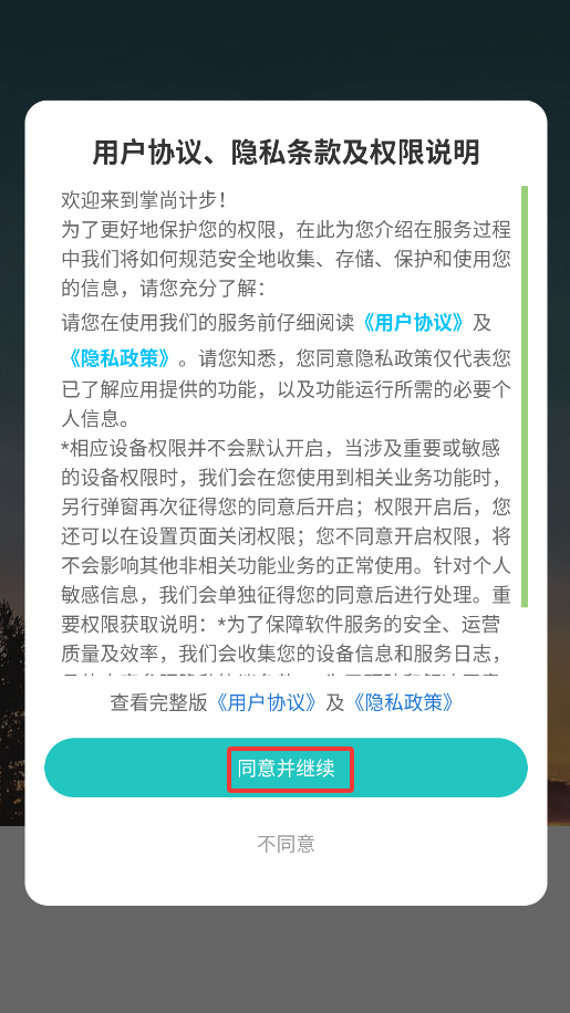 1、首次启动会弹出用户协议,点击"同意"后即可进入运动健康平台主界面。
