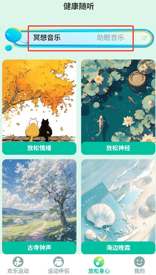 4、"健康音乐"专区包含冥想背景音和助眠白噪音,帮助运动后放松身心改善睡眠。