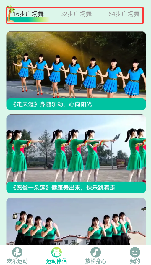 3、"运动教学"板块提供16步、32步、64步等不同难度的广场舞分解教学视频。