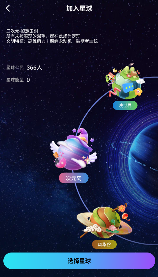 1、启动后,在星球选择界面浏览并点击感兴趣的星球进入创建流程。