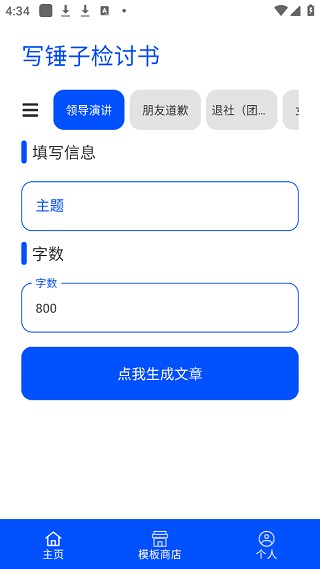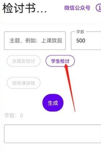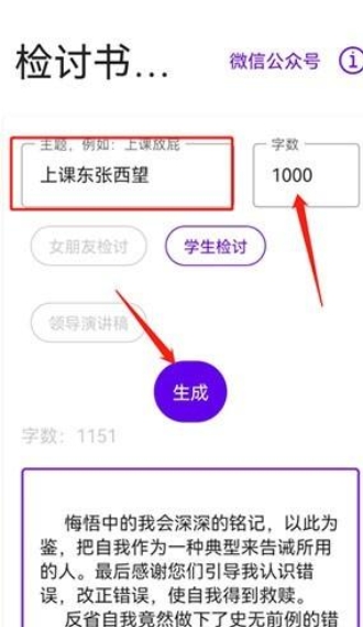 用户只需选择检讨书分类、输入主题信息和所需字数,然后点击“点我生成文章”按钮,即可启动生成流程。