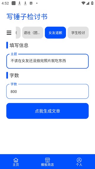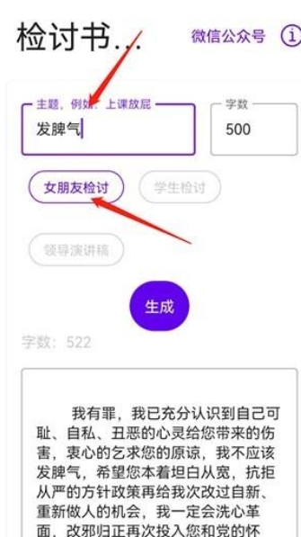 3、写锤子检讨书能适配多种场景,像【女朋友闹脾气】这类情况也能生成对应的内容。