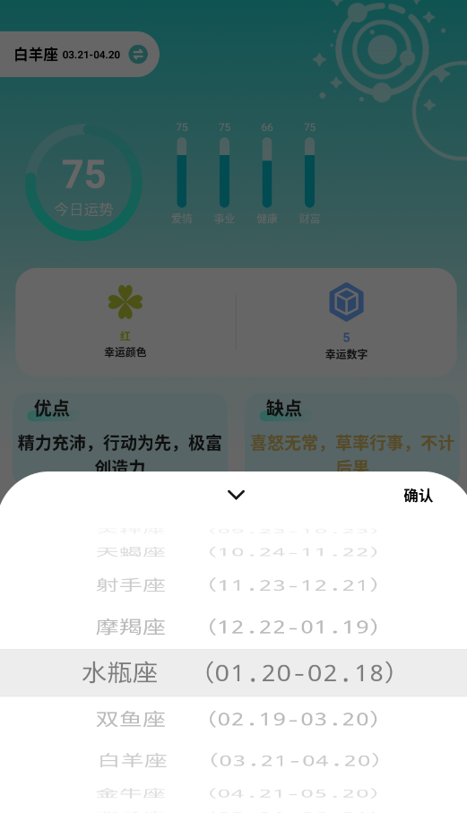 点击星座切换按钮,就能自由选择查看另外11个星座的每日运程预测。