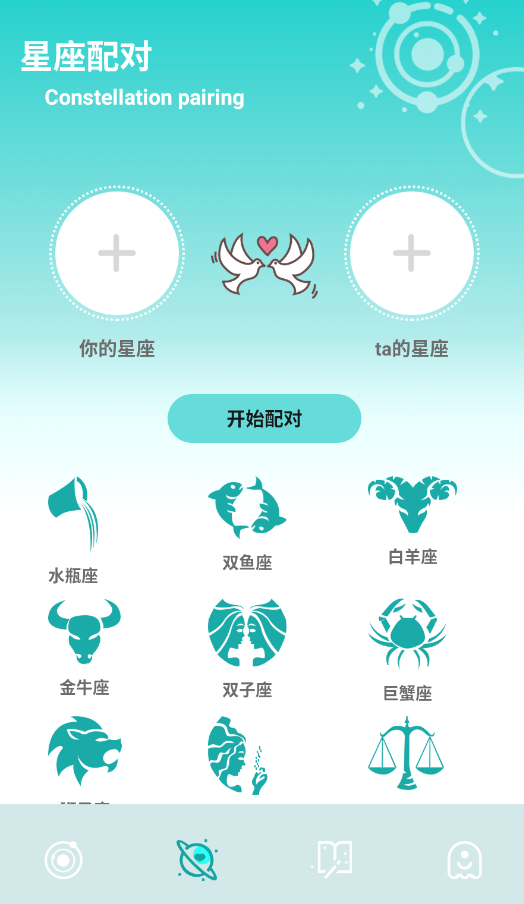 3、进入“星座配对”功能,输入彼此的星座,就能得到情感契合度的分析以及相处方面的建议。