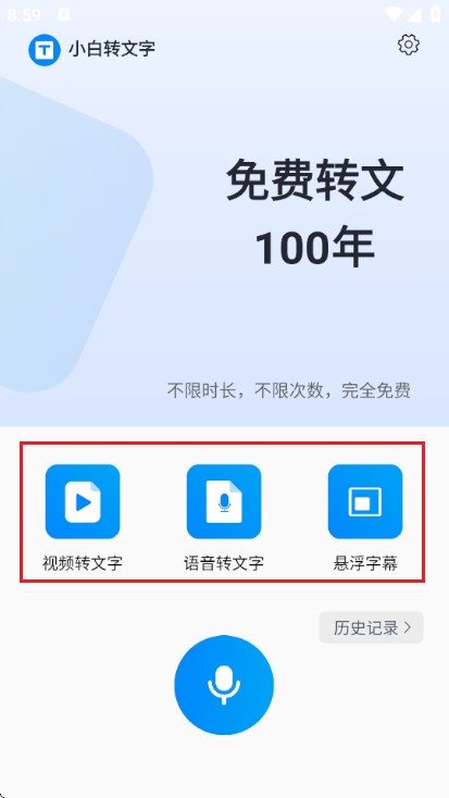2打开软件后,首先映入眼帘的是主界面,这里整合了多种实用功能,包括将视频内容转换为文字、把语音信息转录成文本,以及可以实时显示的悬浮式字幕等服务。