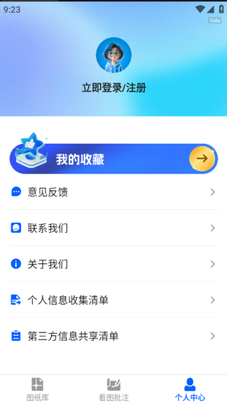 4、点击个人中心,用户在使用过程中若有意见可直接反馈,也能查看自己收藏的图纸。