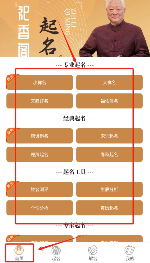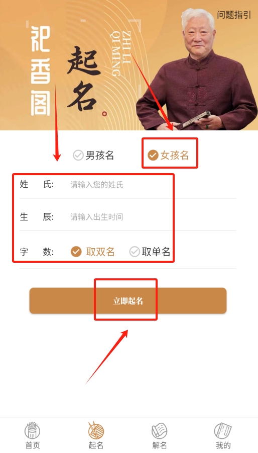 1、 打开祀香阁软件,在首页从生辰、音形义这些选项里挑一个起名的依据。