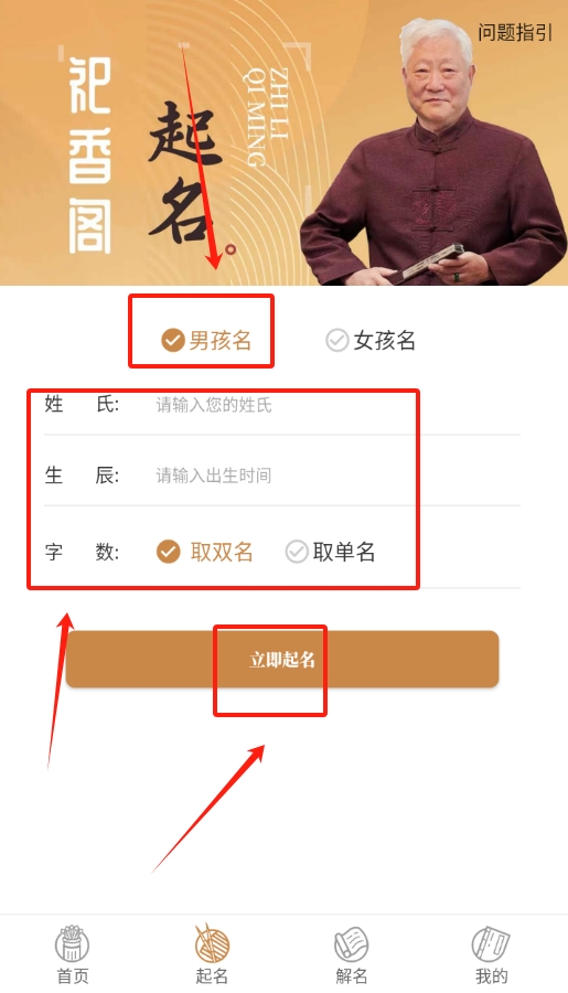 2、 要是给男生起名,就点 “男生” 选项,输入姓氏、出生时间和想要的字数,再点 “立即起名”。