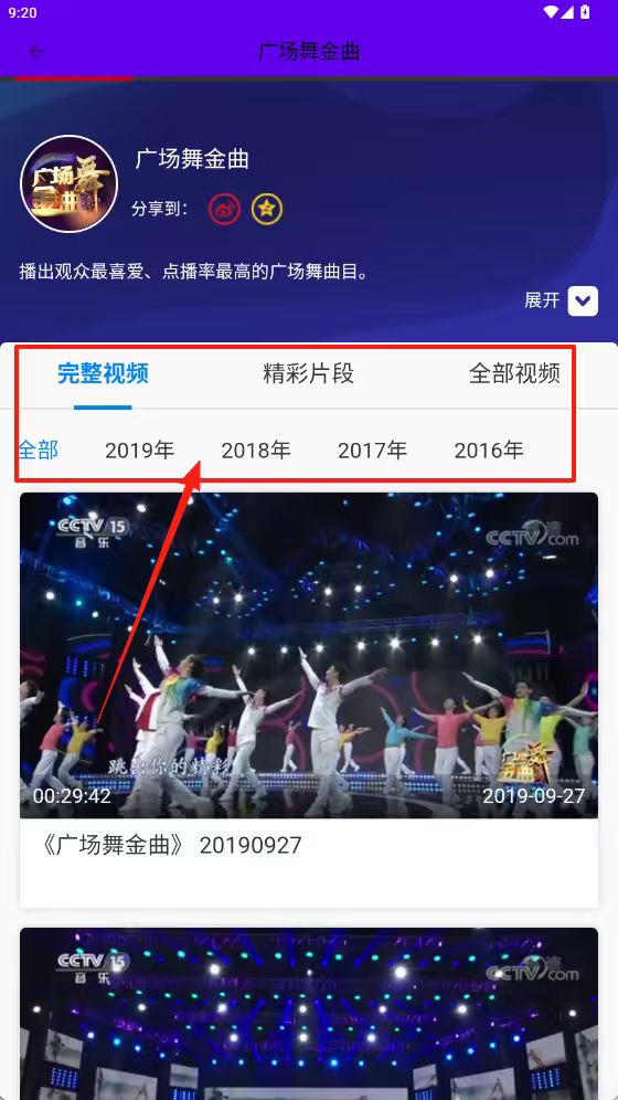 2、在广场舞金曲页,选年份视频,看完整或片段,还能分享出去。