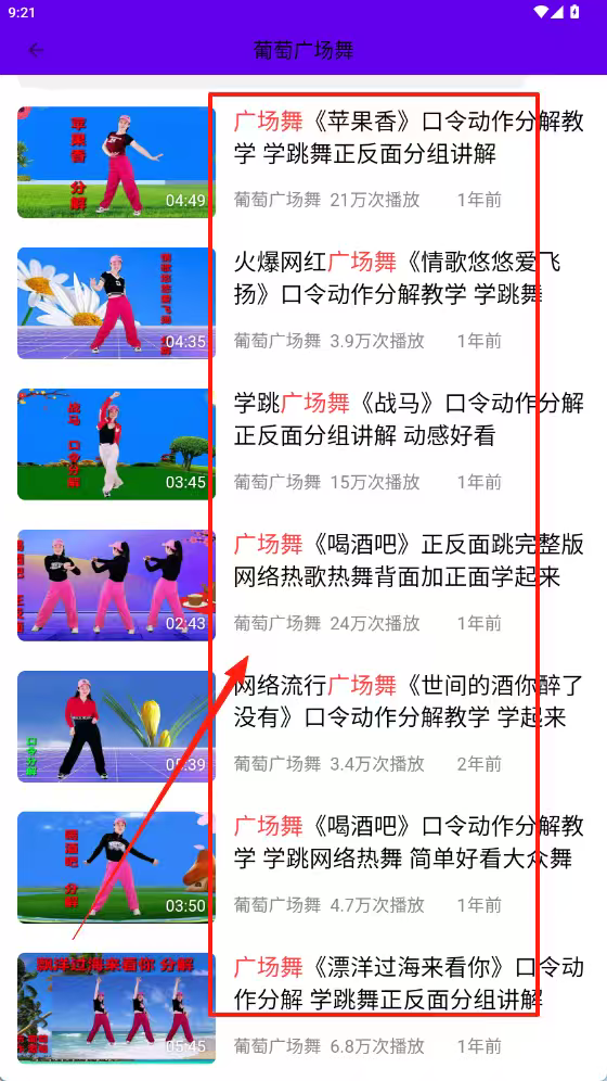 4、葡萄广场舞列表,看舞蹈教学视频,有时长、播放数和发布时间。