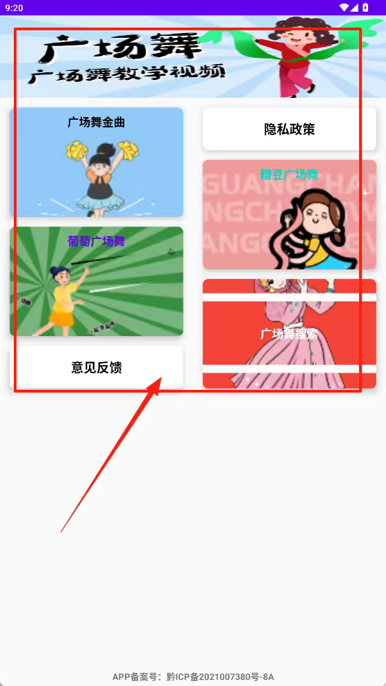 1、点开广场舞主界面,能看教学视频,还能选金曲、搜索、提意见。