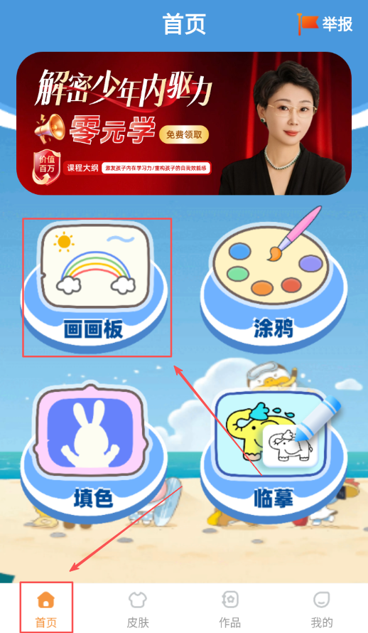 进入儿童画画手绘画板应用后,在软件首页找到标注为“画画板”的选项,点击此选项即可进入绘画操作界面。