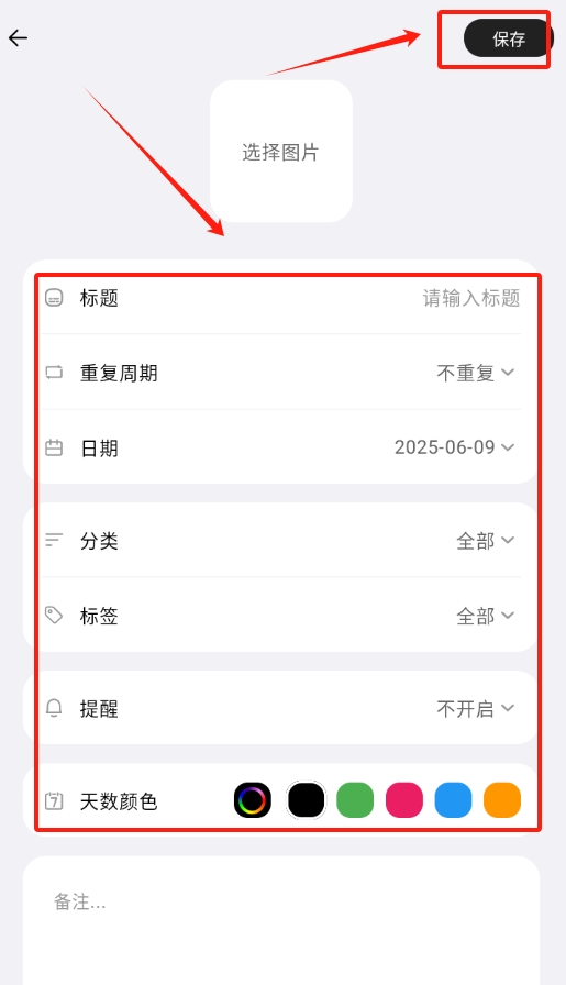 3、填写标题、是否重复、日期、分类、标签、提醒及天数颜色等具体信息后,点击右上角的保存按钮。