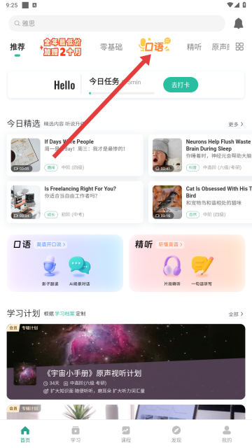 1打开软件后,直接点击顶部的【口语】板块,就能开启你的英语口语提升之旅啦。