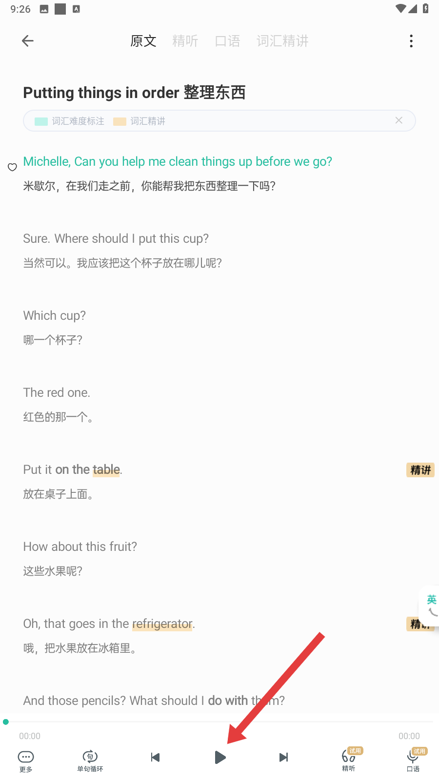 4、进入原文板块后,点击底部的播放按钮,仔细聆听原声内容。同时结合中英翻译,确保听懂每一句话,这样能为后续的口语练习筑牢基础。