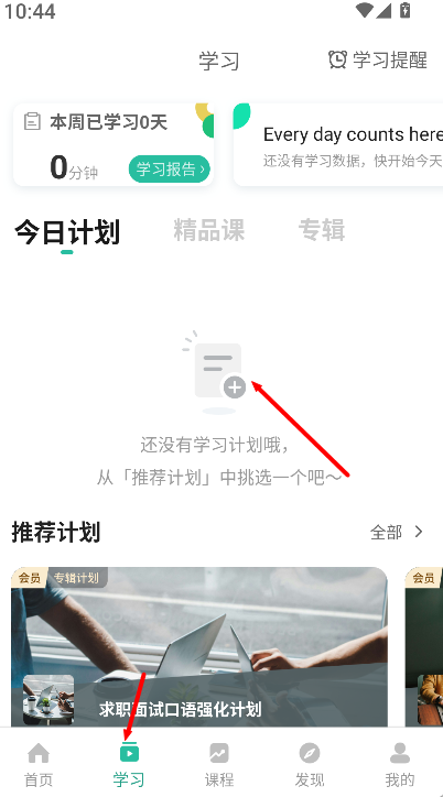 3进入学习板块后,用户能依据个人需要创建学习计划,挑选听力或口语模块,系统会按照设定的内容推送课程并安排练习。