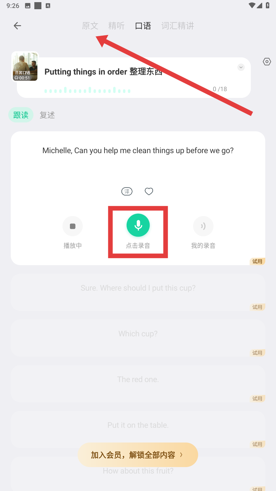 3、进入口语练习环节后,点击【点击录音】按钮,勇敢开口跟读,就能提升口语表达能力啦。