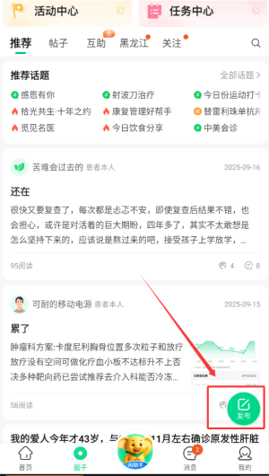 进入“圈子”板块后,用户可以自主发布个人动态、分享自身经历或是参与话题讨论。