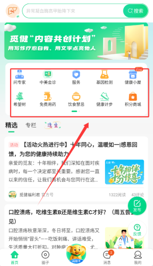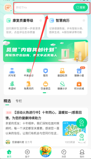 首页顶部的搜索框支持直接输入关键词,以此查询相关疾病的详细资料和科普文章。