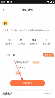 2、在学习计划页面,点击【开始学习】按钮,即可进入词汇学习界面。