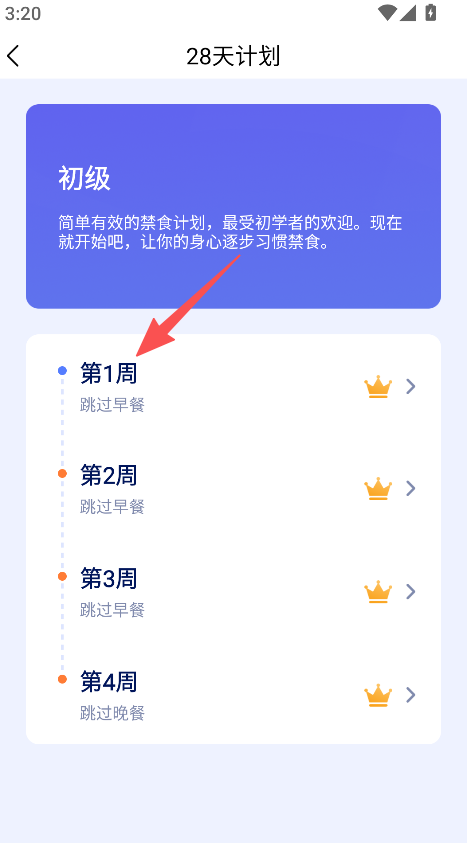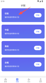 1、进入计划板块,选择断食计划等级(如初级)。