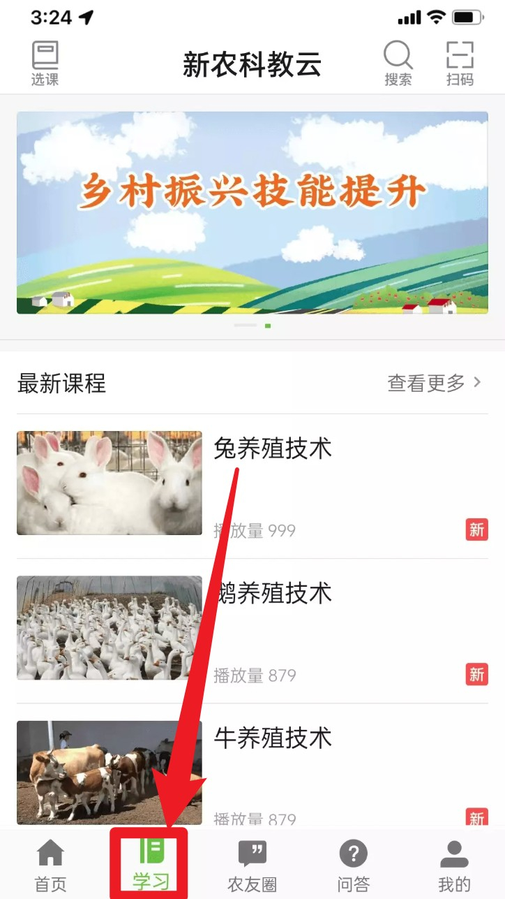1点击底部导航栏的“学习”板块,能查看涵盖养殖技术、种植技巧在内的多种农业相关知识,还能按类别筛选内容并添加收藏。