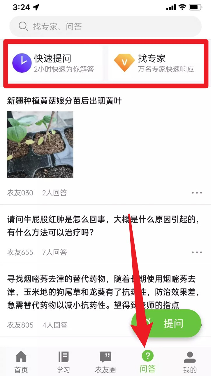 3. 在“问答”页面,您可以快速发起提问,系统会智能匹配相关专家为您解答,同时也能查看其他用户的提问及对应的答案。