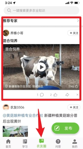 2进入“农友圈”专区后,平台会智能推送行业内的资深农业专家以及社区里的活跃用户,方便大家浏览他们发布的各类内容,也能直接进行关注和互动交流。