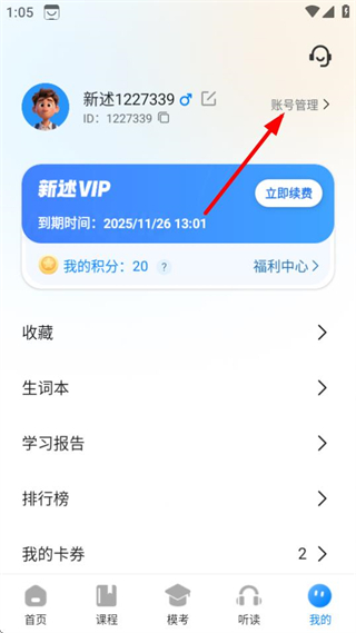 2进入个人中心页面后,找到并点击账号管理选项,即可进入账号管理的设置页面。